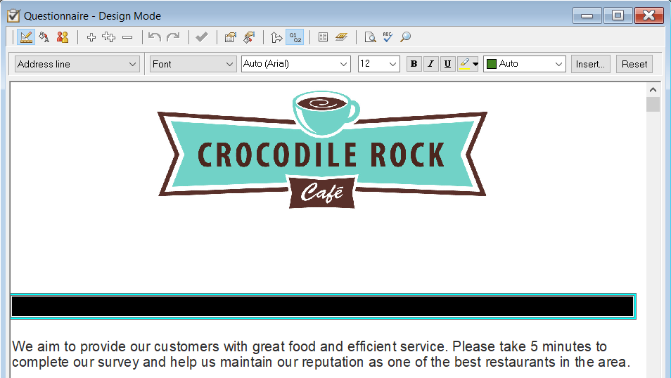 Adding name and address information to a printed survey This worksheet explains how to insert participants’ names and addresses to the first page of a questionnaire or covering letter that can then be printed for mailing. Background This worksheet example adds variables representing the names and addresses to a copy of the Crocodile Rock Cafe survey supplied with Snap. It then uses a database link to populate the survey with the participants’ details. You will need to have a database set up in advance containing the names and addresses of participants. It is important that each address line must be in a different field. Due to the fact that Snap’s standard questions styles do not resemble a typical address format, this worksheet also includes instructions on how to modify styles to take on the appearance of an address. Finally, the worksheet describes how to include the participants’ details on the questionnaire when it is printed. Once the participants have completed and returned the questionnaire, their relevant details can then be keyed into Snap. Subsequently, cases can be matched with records from the external database for the import of other personal information. Summary of steps Step 1: Adding the name variable to your survey Step 2: Creating the address line style Step 3: Adding the address variables to your survey Step 4: Importing the respondent information Step 5: Previewing and printing your survey Step 1: Adding the name variable to your survey Open the survey in Design mode and create a new question below the subtitle. Either press [Enter] to insert the question after the current one or click to insert the question before the current one. Select the Open Ended style from the Style Selection Box on the toolbar. Type “Name:” in the area marked “Click here for text”. (This is only used for reference while creating the style.) Click the Variable Properties button . The Variable Properties dialogue opens. Change the question Name property to “Name” and click [OK]. The word “Name” now appears in place of the question number. Step 2: Creating the address line style Because the name and address variables are to be loaded from a database, and need to be placed in a specific position on the page, you cannot use any of the default styles. Instead, you must create a new style for them. This style will produce an empty response box at the left side of the page. Select the Name question you have just created. Move the code box to the right of the question by selecting Positions in the toolbar topic list. Set the question Position to Beside. Select Columns from the drop-down list and set it to Full Page. Set the number of columns to 1, if it is set differently. Select Tabs in the toolbar topics, and then select Text in the drop-down list. Set the tab value to 0%. The space for the question text disappears, but that is fine, as it will be hidden. (The tab value sets the space reserved for text. You can move the response box to the right by increasing this value.) Select Alignment in the toolbar topics and then select Code Box in the drop down list. Click the left end of the alignment value box to set it to Left. Use [Ctrl]+[+] to expand the response box until it is large enough for your address lines. Select Show from the toolbar topics drop-down list and uncheck the boxes for Name and Text. With Show selected, select Space before in the drop-down list, and set the Gap to 0.01cm. This specifies the gap between the lines of the address. You may need to set this to 0, or hide this space completely. Select Margins in the toolbar topics, and then select Data in the drop-down list. Set all the margin values to 0. This specifies the space between the box and the response data. Click or press [Ctrl]+[M] to go to Style mode. Click to go to the Style Organiser. The style you have been working on will be selected in the left pane. Click [Properties] and type “Address line” in the Name field then click [OK]. This creates a new style called “Address line”, containing your changes. Click [OK] to close the Style Organiser. Click or type [Ctrl]+[M] to go back to Design mode. Step 3: Adding the address variables to your survey Select the Name question that you have just inserted. Look at the Style box. If your new Address line style is not selected, select it to apply it to the Name question. Press [Enter] to create a new question. It is automatically created in Address Line style. Click the Properties button and change the question Name property to “Address_1” and click [OK]. Repeat to create variables for the maximum number of address lines stored in your database. The example shows Address_1, Address_2, Town, Post_zip_code. Note that no spaces can be used in variable names. Change to Style mode (press [Ctrl]+[M] or click ) and remove the boxes from the Address line style. While they make it easy to locate the variables in the questionnaire, they do not improve the look of the printed address. Select Boxes in the toolbar topics, and then select <None> in the drop-down list. Note: box outlines not available for scanning editions. The questionnaire now appears to have a blank area where the address variables are. Step 4: Importing the respondent information Select File | Database Link to display the Database Linkage dialog box and click [New]. The Database Wizard dialog is displayed. Select the Import from database option and click [Next>]. Click [Select Database File] and browse to the file containing the respondent data. (If the file is of an unrecognized type, you can identify it to Snap using the [Build Data Link…] button.) Select the table to use and click [Next>]. (If you do not wish to import details for all the participants in the file, you can set a filter here.) The dialog displays a list of Import/Export Options. Select Append all cases. This option imports new cases from the database and appends them to the existing cases in the database. If you already ha