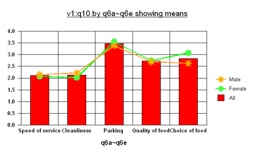 Creating a combination chart to display respondent means as points and bars This worksheet explains how to use a combination chart to compare the means of groups of respondents in a satisfaction survey with the mean responses of all respondents. The worksheet uses the data provided in the snCrocodile survey supplied with Snap to display the average satisfaction for men and women at the Crocodile cafe against the average satisfaction of all respondents. To make it obvious which the reference values are, they will be displayed as bars, whereas the individual means for men and women will be displayed as points. Background The snCrocodile survey includes questions to classify respondents by age and gender. These allow you to use this information to target marketing or to focus on where your service could be improved. While you may sometimes wish to compare the groups of respondents directly, you may also wish to see how various groups of respondents have answered when compared to a baseline. To create the average respondent, you create a variable that is set to true for all respondents, and you can then analyse the satisfaction of all respondents against the satisfaction of any other groups that you define. To make this comparison clear, you can use a combination chart so that the baseline values are displayed in a different format to the selected groups. In this example, a bar chart is used for the baseline values, and line charts are used for the group values. The line charts can be set up to have different symbols for the datapoints of each group. Summary of steps Step 1: Add the derived variable to your survey Step 2: Create a combined chart Step 3: Style your chart to display points and bars Step 4: Set up the datapoint markers for your chart Step 1: Adding the derived variable to your survey Open the snCrocodile survey in Snap. Click to open the Variables window. Click to create a new variable. Set the Label to All Respondents. Set Type to Derived and Response to Single. Click in the Code Label area and set the it to All. Set Values for that code label to True. Click to save the new variable. By default it is given a name of V1. Step 2: Creating a combined chart Click to open the Results Definition dialog. Change the Chart style to Bar 2D. Set the Analysis field to Q6a~Q6e. This includes all the satisfaction questions (you can check what they are in the open Variables window). Set the Break field to V1: Q10. (V1 is your newly created derived variable, Q10 is the gender question). Set the Calculate field to Means & Differences. Check the Transpose box under Options. Click [OK]. The chart window opens, displaying the defined bar chart. Step 3: Styling your chart to display points and bars Open the chart designer by clicking on the chart toolbar. The chart designer dialog appears. Highlight Chart in the left-hand pane if it not already selected. This is the section of the chart designer that defines the overall look of the chart. Ensure that the 2D radio button is selected and click Combination in the list of chart types. Click [Apply] to use these settings without closing the chart designer window. Select Series in the left-hand pane. This is the section of the chart designer dialog that deals with the display of the break and analysis data. This is where you specify that in the combination chart, you wish to display the All information as bars, and the data split by gender as lines. Click All Series box and check that Bar is selected in the Display As box. Select Male in the Series box and select Line in the Display As box, then do the same for Female. Click [Apply] to use these settings without closing the chart designer window. The visible chart should change to show a combination bar and line chart. Unfortunately, the bars are in front of the lines, making it difficult to see them. Select Series in the left-hand pan again, and click the Order tab. Select All in the list and click the [Down] button twice to move it to behind the Male and Female displays. Click [Apply]. The chart updates to place the lines in front of the bars. Step 4: Setting up the datapoint markers for your chart Now you have created a combination chart, you want to mark the points that represent the data values for men and women, instead of just having them as points where the lines angle. For simplicity, use a blue square to mark points for men, and a red circle to mark points for women. Click the cross box by Series in the left-hand pane to show the list of the variable codes in the Break. Click the cross box by Male to show the list of controls for displaying the information for the data for Male. Select Datapoint defaults. This is where you specify how the datapoints for Male will be displayed. Click the Markers tab to define the markers. (You can specify the line colour in the Fill tab.) Check the Show markers box. Set the Style to Star. Leave the Color, Size and Pen Width as they are. Click [Apply] to update the chart. Display the Datapoints information for Female in the same way. Select the markers tab, show markers and set the style to Filled Circle and click [OK] to close the chart designer. Fine-tuning your chart If you wish, you can make further changes to your chart. You can change the colour and style of the line, got to the Lines tab for the selected series. You could even remove the lines entirely, so that the point markers are floating on their own in front of the bars. Note that changing the line colour doesn’t change the marker colour. You can change the colour and look of the bars by selecting Datapoints in the All series in the left-hand pane and selecting the Fill tab. If there is a topic you would like a worksheet on, email to snapideas@snapsurveys.com