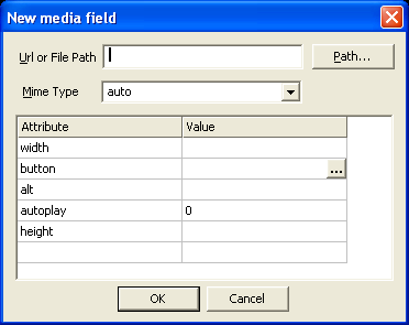 3. The New media fielddialog opens. Click [Path] to choose the file you want to insert. The file must be on your local PC or network. Snap can recognise most multimedia file types.