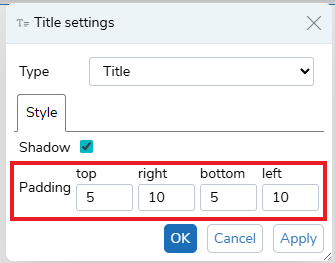 The padding changes the margins between the edge of the widget display area and the widget, such as, a title, chart or table. The Padding range is from 0 to 20. This is available for all widgets.