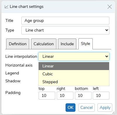 This changes the style of the line in Line charts only. You can choose from Linear, Cubic and Stepped.