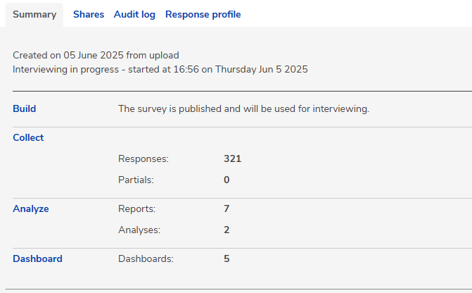 Dashboards are available for each survey in the Dashboard section, accessed through the survey’s Summary.