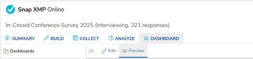 They can also be accessed by clicking the the Dashboard link from the Build, Collect or Analyze sections of the survey.