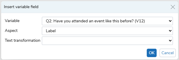 - In Aspect, select the type of text to insert. There are two aspects to choose from: Label inserts the question response; Name inserts the question number.