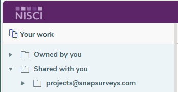 Your work contains two folders: Owned by you and Shared with you. The Owned by you folder contains surveys, templates and folders that you have created or licensed. The Shared with you folder contains surveys, templates and folders that are owned by other users, who have shared access with you.