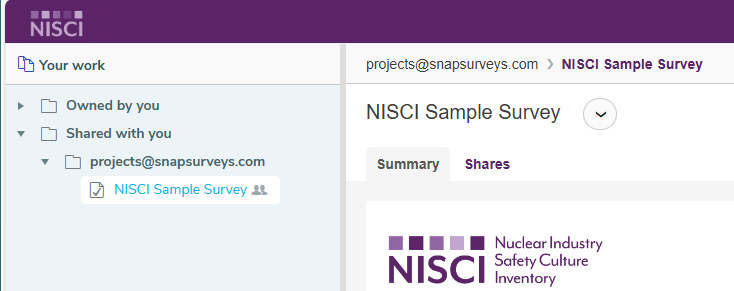 - Your work, where you can see the surveys, folders and templates that are owned by you and that are shared with you by other users.