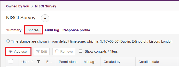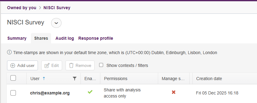 - Select the Shares tab. This lists the users that have shared access to the survey.