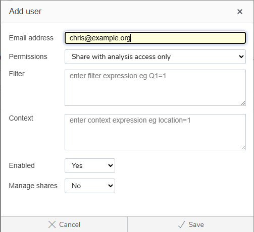 - Click the Add user button to enter the details of the user you want to share access to the survey.