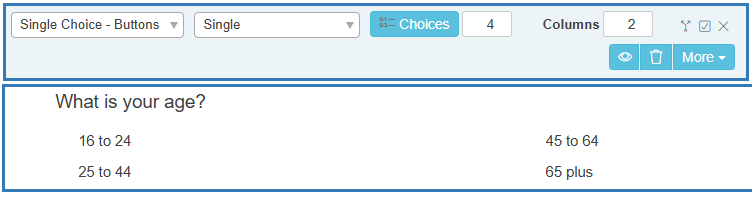 - Insert a Single Choice – Buttons question into the questionnaire by double-clicking or by dragging the question to the questionnaire.