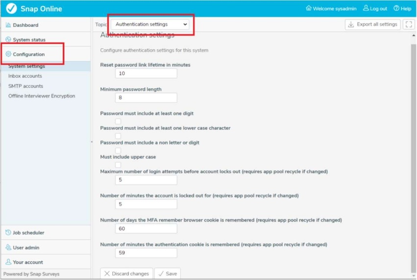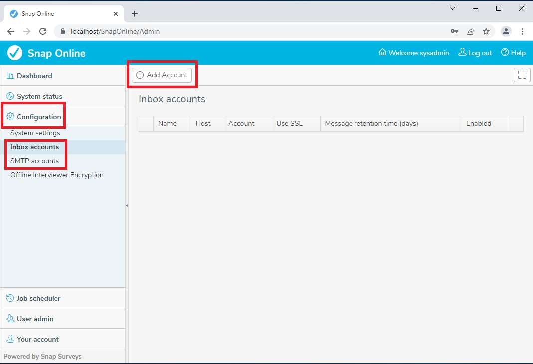 Snap Online can be configured to send and receive emails. Snap Online uses the SMTP server to send emails regarding administration tasks such as password reset and invitations to participants as well as email alerts configured on a survey by survey basis. The SMTP and POP3/IMAP mail servers can be set up to use basic authentication or Office 365 Exchange Online OAUTH certificate or secret key based authentication – details can be entered in the Inbox and SMTP account pages. See the additional Help guide ‘Inbox set up when using OAUTH and Office365.pdf’