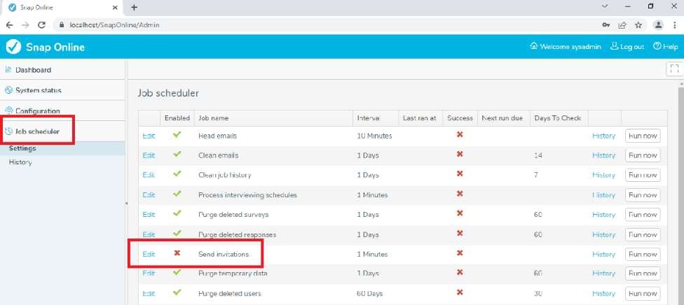 After an SMTP mailer has been configured you will need to enable the job which is periodically called to send the invitations. Select Job scheduler in the accordion and Edit the ‘Send invitations’ job: