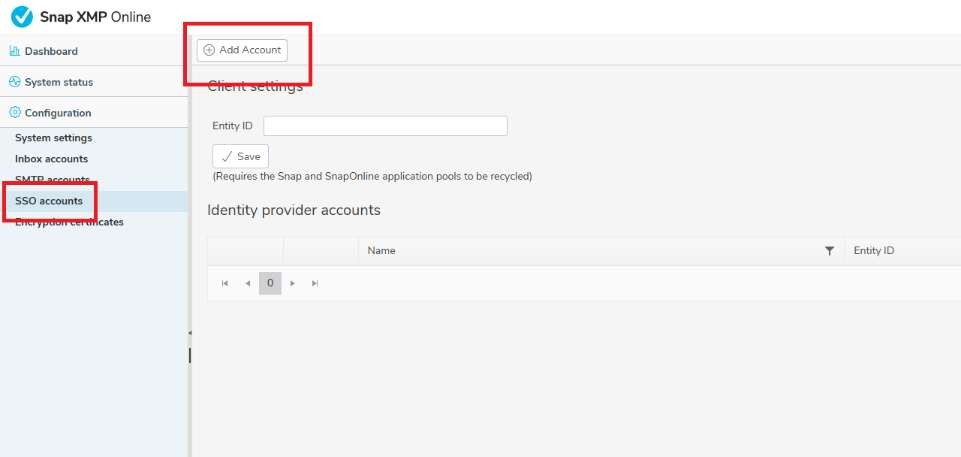 Each account can be configured to use Snap Online authentication or can be set to use an alternative SAML2 Single sign on provider such as Microsoft Azure or OKTA. The identity providers can be set up via the SSO accounts configuration option. See the additional Help guide ‘Setting up the Identity provider for Snap XMP Online.pdf’ for details.