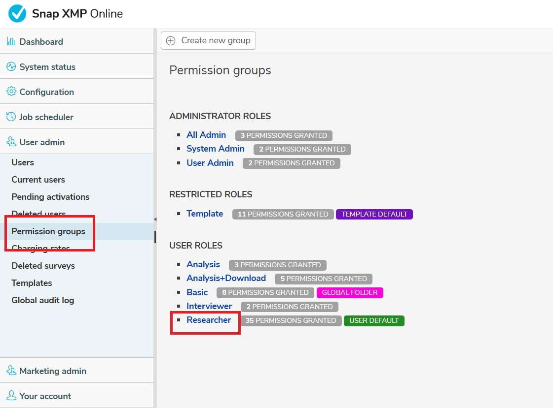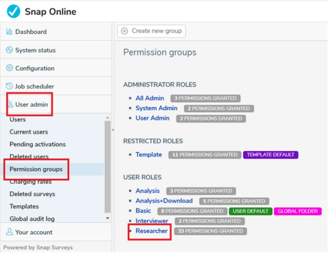 Each account on the system has a permit (which details what the account is able to to) and a licence (how much the account can do). Permits are defined by Permission groups and allocated when the user is created and can be changed at any time. Some default Permission groups are created during the installation process eg Researcher (the permit for users who need to create surveys), Analysis (the permit for users who just need to view reports and analyses) and Interviewer (the permit for users who use the mobile interviewing app (Snap Offline Interviewer) to conduct face to face or kiosk based surveys). The Permissions groups can be adjusted to enable or disable functionality. On saving a change any account using that Permission group will be affected immediately.