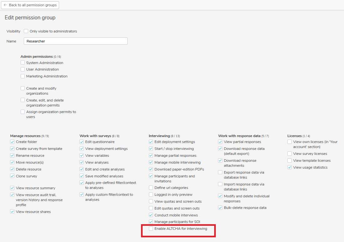 The default ‘Researcher’ permit can have the ‘Enable ALTCHA for interviewing’ permission selected: