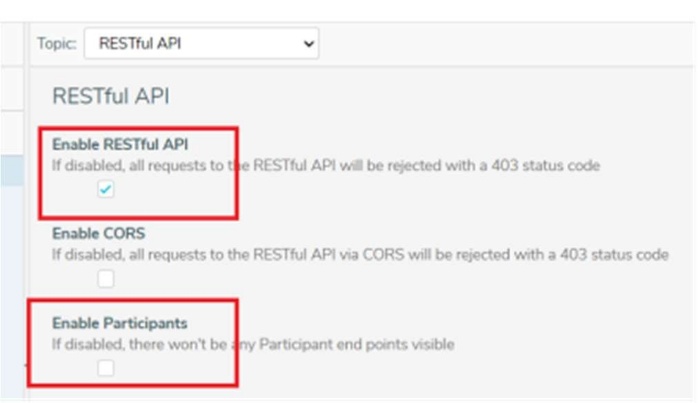 Access to survey information and response data is controlled by ‘Enable RESTful API’ and access to participant information (to add, update and delete) is controlled by ‘Enable Participants’