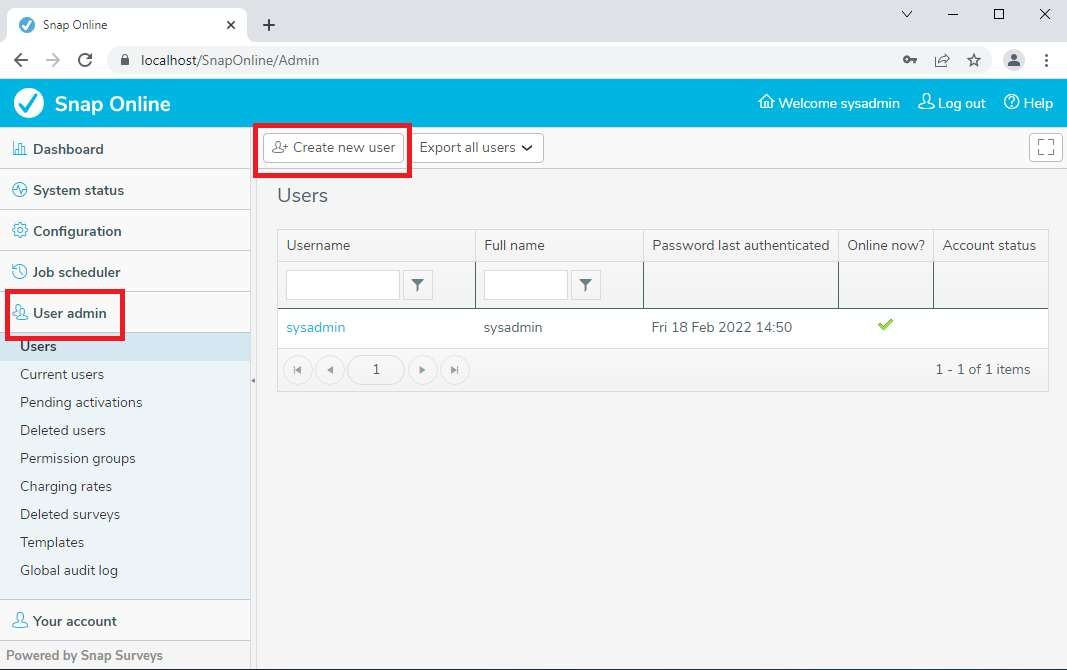 Select User admin in the accordion and select the ‘Create new user’ option: