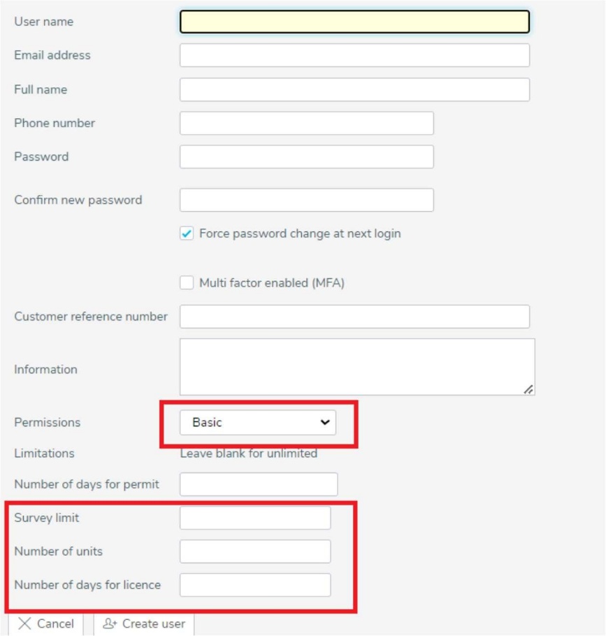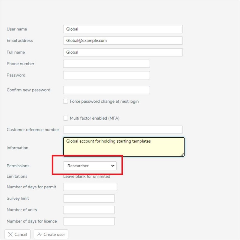 Fill in the details, setting the Permissions to be ‘Researcher’ and select the ‘Create user’ button at the bottom of the page: