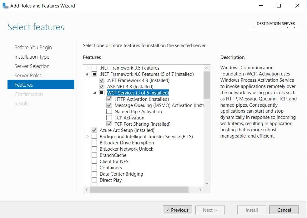 - Add the HTTP activation for WCF services and the Message Queuing (MSMQ) Activation (including the features required):