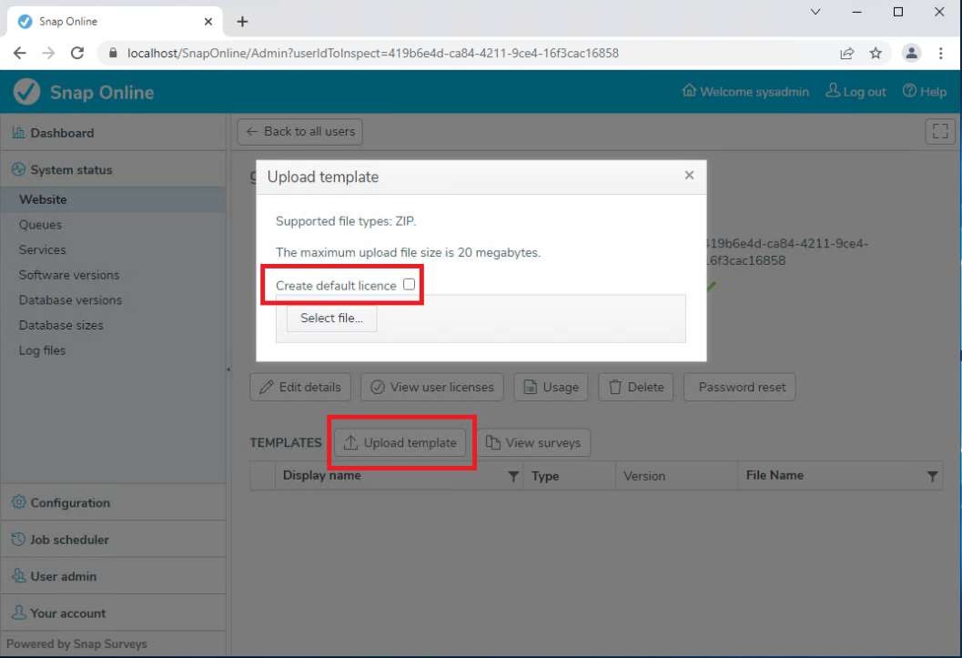 Select the account and use the ‘Upload template’ option to upload a zip file containing a Questionnaire template and an optional image (with the same name as the template). A blank starting template can be found in the ‘Questionnaire templates’ folder alongside the SnapOnline installer setup.exe. Untick the ‘Create default licence’ option before selecting the file: