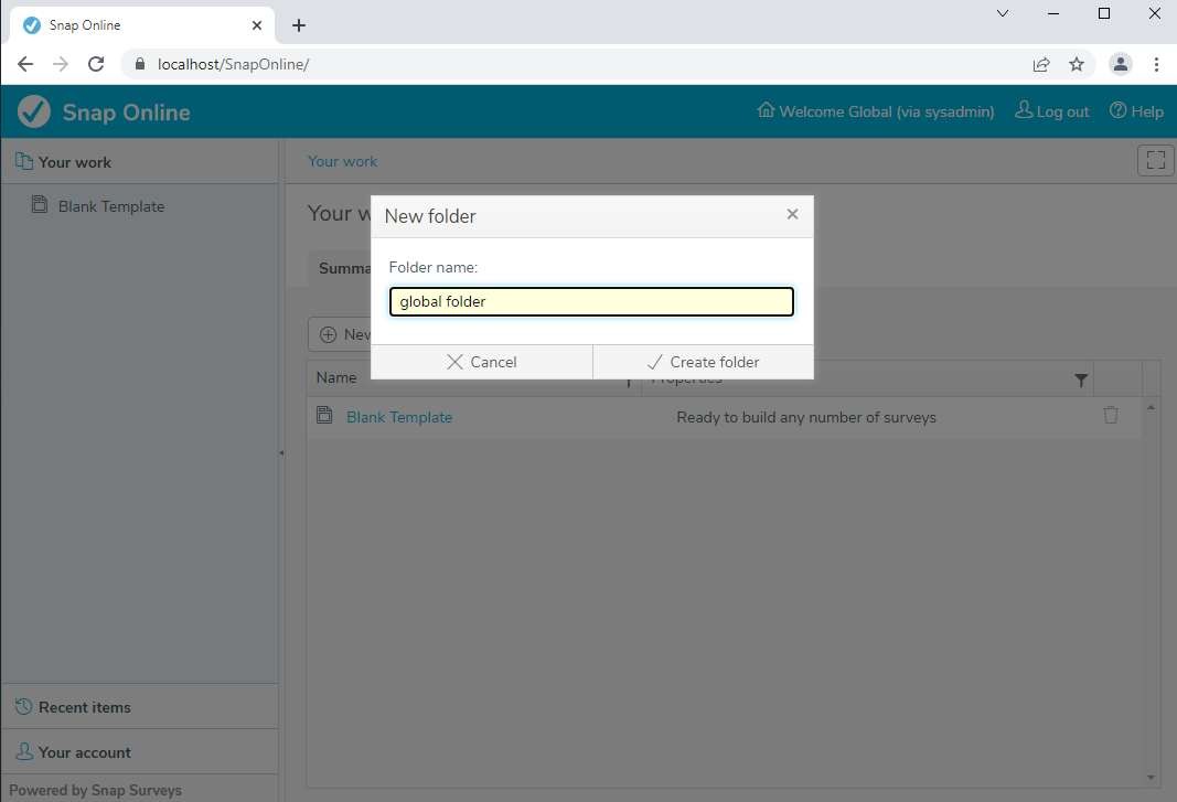 To create surveys in the Snap Online editor you need to have a starting template. Snap Online can be configured to share the contents of a global folder so that any starting templates you upload to this folder will be available to all accounts.