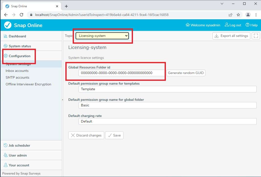 Log out of the account to return to the Admin area. Select Configuration in the accordion and select the ‘Licensing-system’ topic. Copy the folder ID into the ‘Global Resources Folder id’: