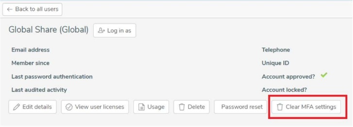 If a user has a problem logging in after setting up MFA a User admin is able to clear the MFA settings reverting the user back to basic authentication: