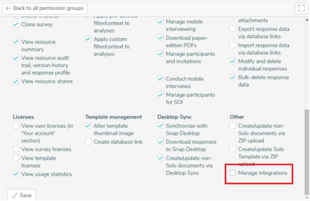 If you want to create a new Permission group (eg Researcher with API) then select the ‘Create new group’ option at the top of the Permissions page, set it to have the same options as Researcher and then add the Manage integrations option. You would use this method if you want to limit which accounts can be accessed via the API. The account that you want to use for the API will need to have a permit that has this permission – so either Researcher if you have modified that or the new one you created.