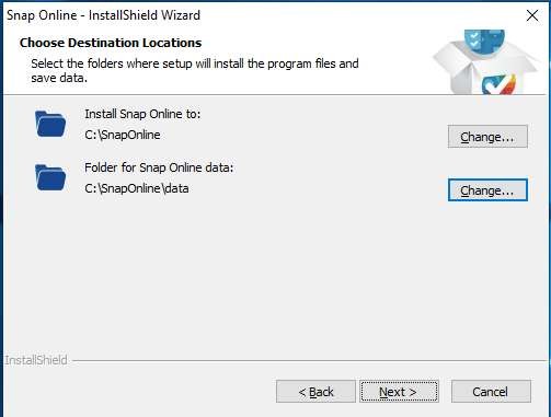 Select where you would like the Snap Online software to be installed and the folder you would like to use to store the survey data.