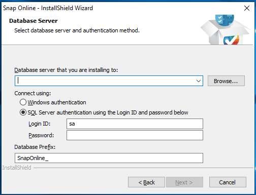 When prompted select the SQL server and specify the user credentials and prefix chosen for the databases: