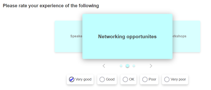 A carousel is another way of displaying a question that contains a number of rows, such as a grid or semantic scale. Each row is presented as a card showing the question and the respondent answers the card shown before moving onto the next one. The carousel can be set to move onto the next question automatically or manually by clicking navigation buttons. The respondent can navigate through all the cards to review their answers. There is also an option to show the count out of the total number of aspects to answer.